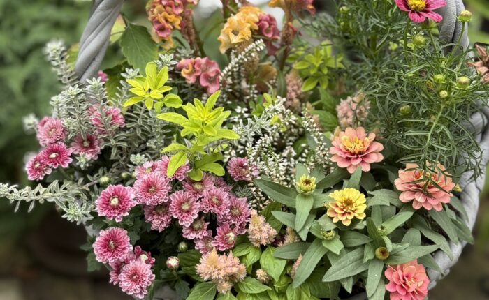 秋色の花々を合わせた寄せ植えギャザリング。優しいピンクとベージュが調和するバスケット。