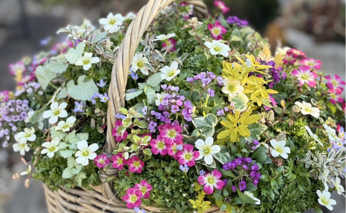 白い手袋をした手で、春の花苗を籠に丁寧に植え込むギャザリング制作風景。色と高さを重ねながら奥行きをつくっている様子。