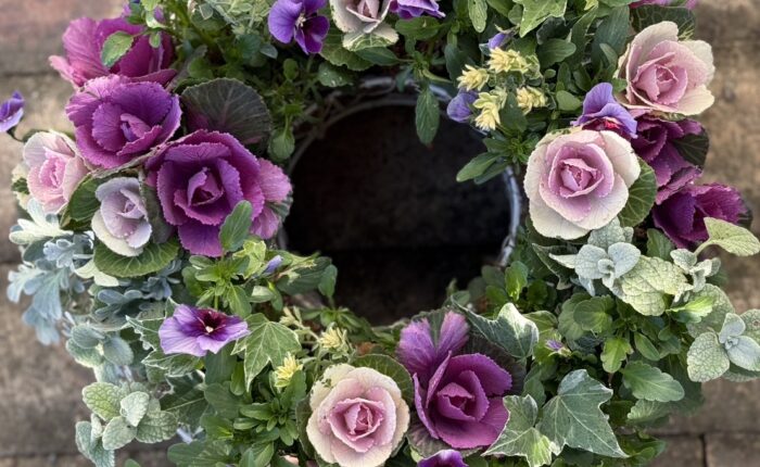 淡いピンクと紫の ornamental cabbage(葉ボタン)とパンジーが輪の形に寄せ植えられたリース。緑の葉やシルバーリーフが彩りを添え、全体がふんわりと丸く広がっている。背景は少し古びたレンガ調の地面で、落ち着いた雰囲気の中に鮮やかな花色が浮かび上がって見える。